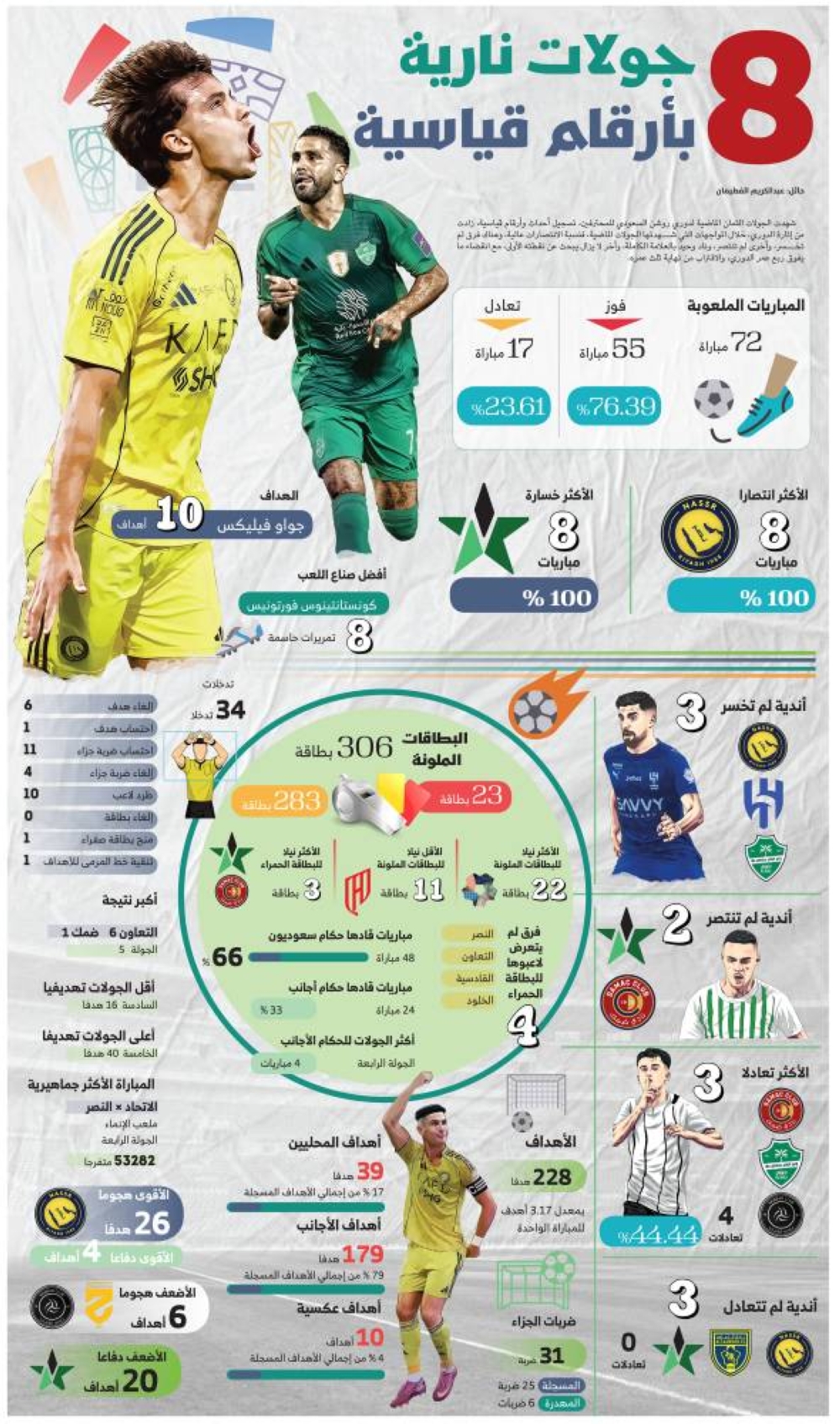 شهدت الجولات الثمان الماضية لدوري روشن السعودي للمحترفين، تسجيل أحداث وأرقام قياسية، زادت من إثارة الدوري، خلال المواجهات التي شهدتها الجولات الماضية، فنسبة الانتصارات عالية، وهناك فرق لم تخسر، وأخرى لم تنتصر، وناد وحيد بالعلامة الكاملة، وآخر لا يزال يبحث عن نقطته الأولى، مع انقضاء ما يفوق ربع عمر الدوري، والاقتراب من نهاية ثلث عمره.