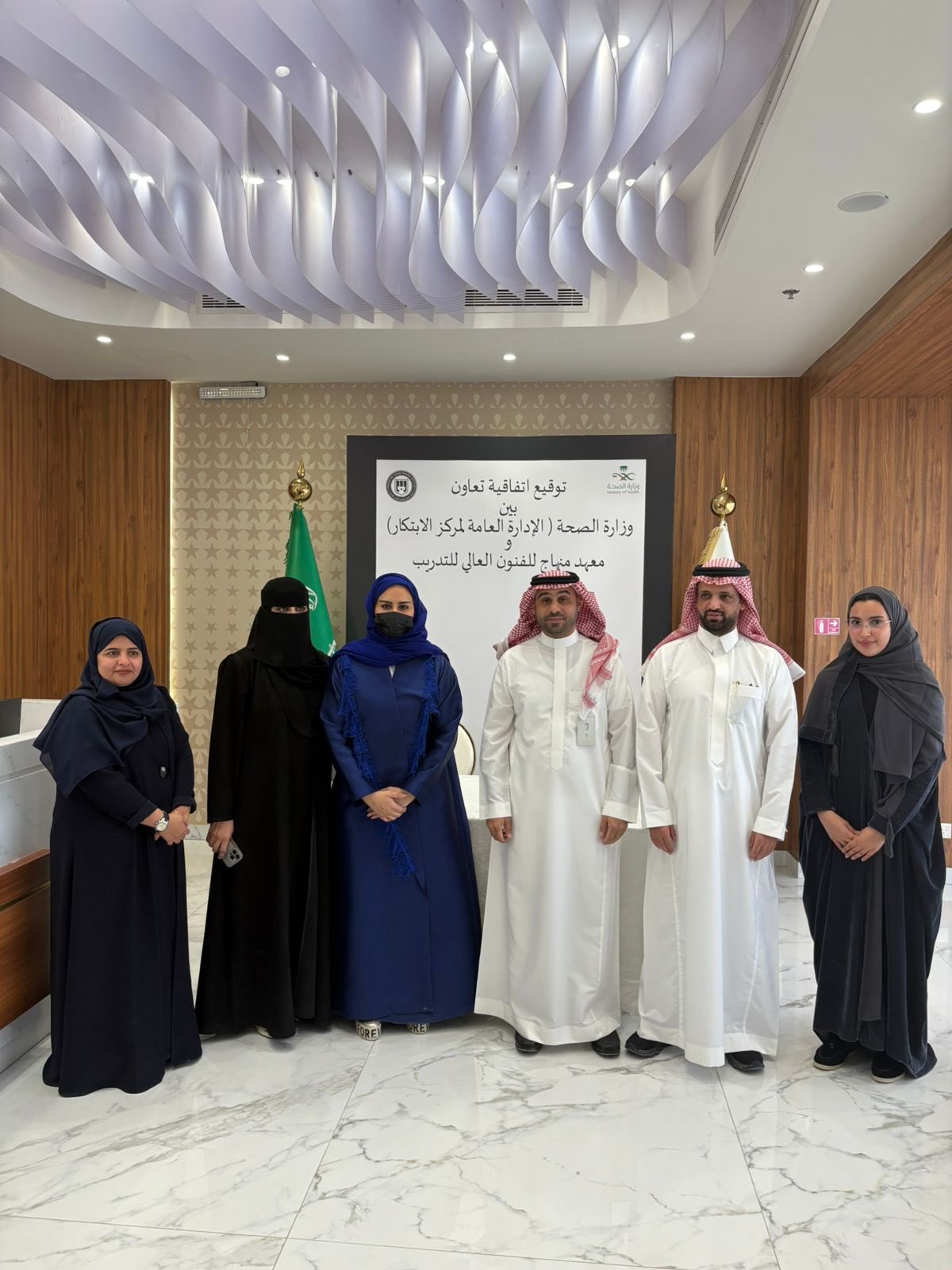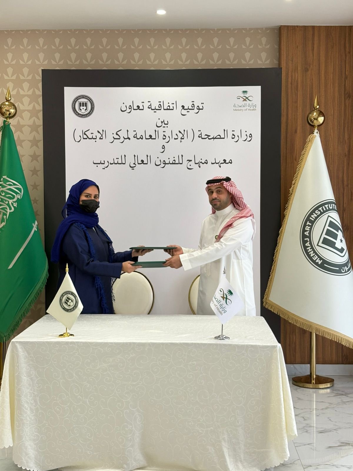 ومثل وزارة الصحة في توقيع الاتفاقية الأستاذ إبراهيم عسيري، نائب مدير مركز الابتكار بوزارة الصحة، بينما مثل المعهد الأستاذة هيفاء بنت منصور الجبيله، المدير العام لمعهد منهاج للفنون العالي للتدريب.