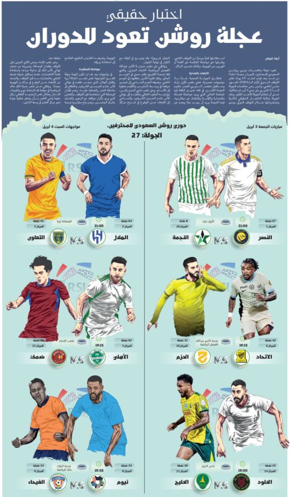 تعود عجلة منافسات دوري روشن السعودي للمحترفين، للدوران مجددًا، ابتداءً من غد، بعد غياب امتد 19 يومًا، نظير التوقف الدولي لأيام الـ(FIFA)، لشهر مارس الماضي، وتدور رحى منافسات الجولة الـ27 للدوري على مدى 3 أيام متتالية، على أن تختتم الجولة الأحد المقبل، وتعد الجولة بمثابة الاختبار الحقيقي للأندية وتحضيراتها خلال التوقف الدولي، ومدى استفادتها فنيًا وبدنيًا من التوقف الماضي، وقدرتها على مواصلة المنافسة على القمة أو الهروب من الهبوط، وكذلك تحسين المراكز.